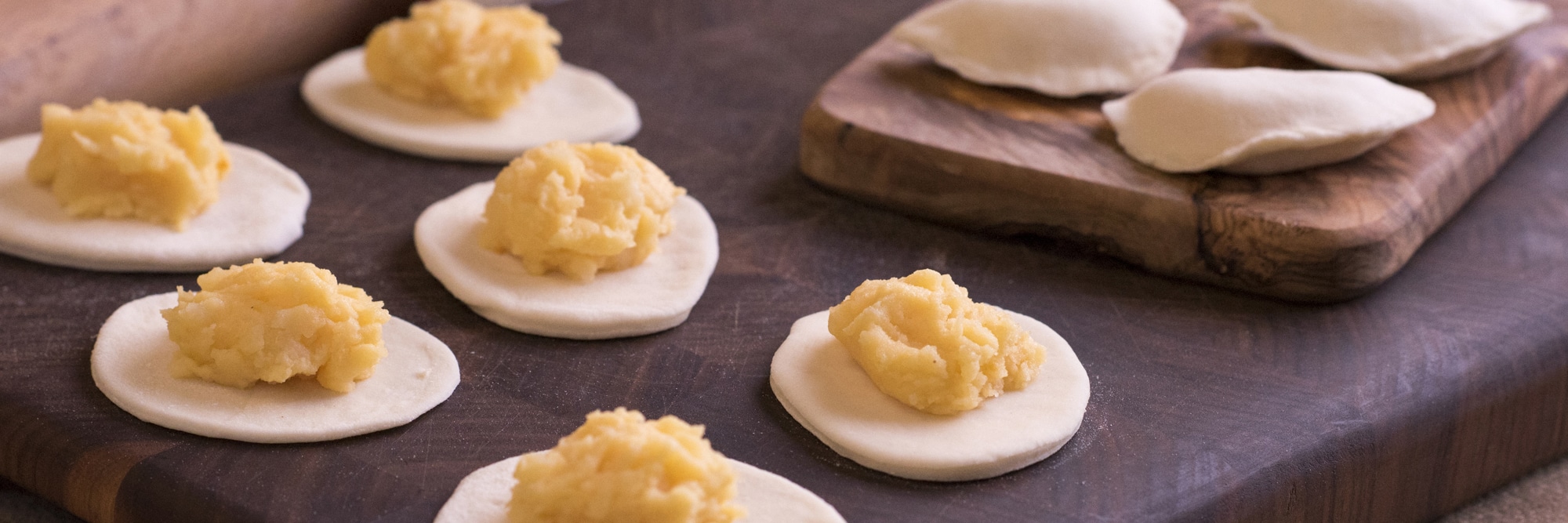 Perishke are baked or fried yeast-leavened boat-shaped buns were once a popular street food in Ukraine. Known more affectionately to some Canadian-Ukrainians as cheese buns, they are be filled with a variety of items - ours feature dried cottage cheese & potato.